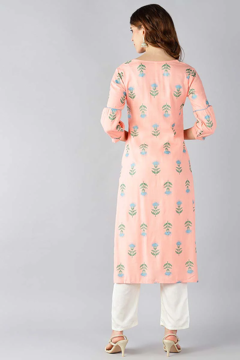 Peach-coloured and blue printed straight kurta, has a notched round neck, three-quarter sleeves, straight hem, side slits