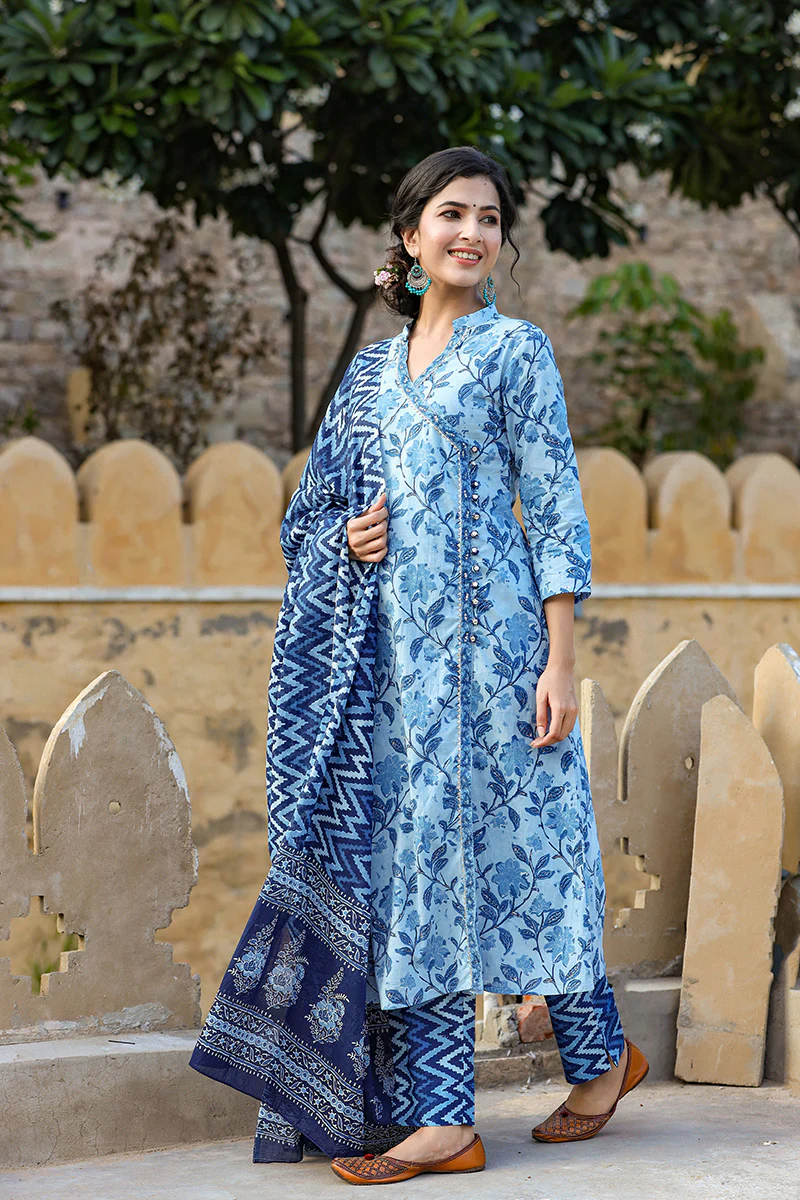 Blue Cotton Angrakha Suit Set VKSKD1226