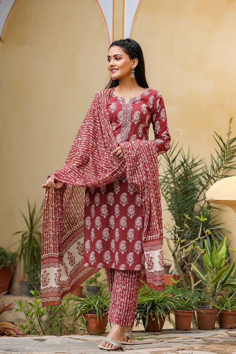 Ahika Women Burgundy White Printed Kurta And Palazzo is an iconic blend where comfort meets elegance. The plush Rayon Blend maroon fabric feels comfortable against the skin, and detailed traditional Indian prints make the kurta set a classic regular Indian wear. It comes with an embroidered dupatta and a straight pant style palazzo for a contemporary look.