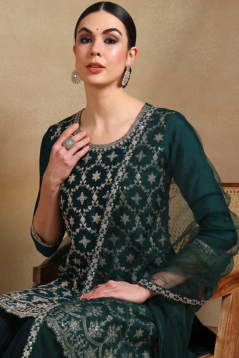 Green Silk Blend Embroidered Kurta Sharara With Dupatta PKSKD1865