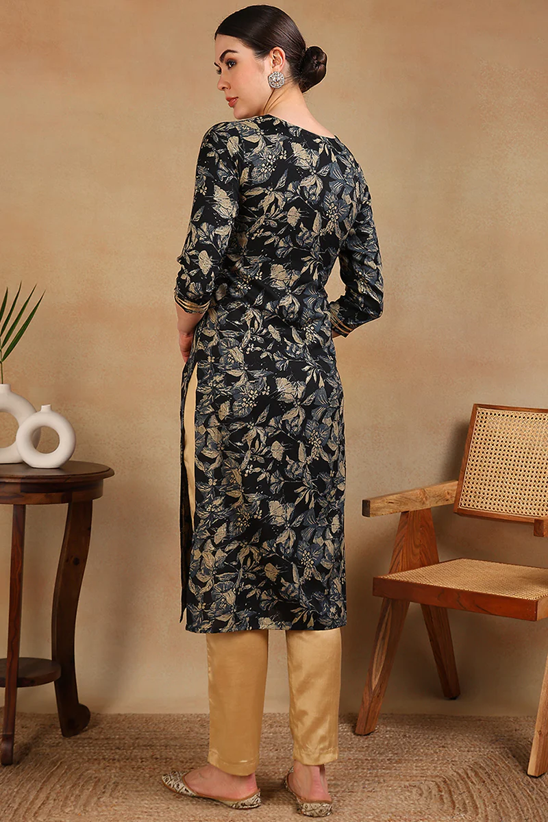 Navy Blue Silk Blend Floral Printed Straight Kurta VCK9698