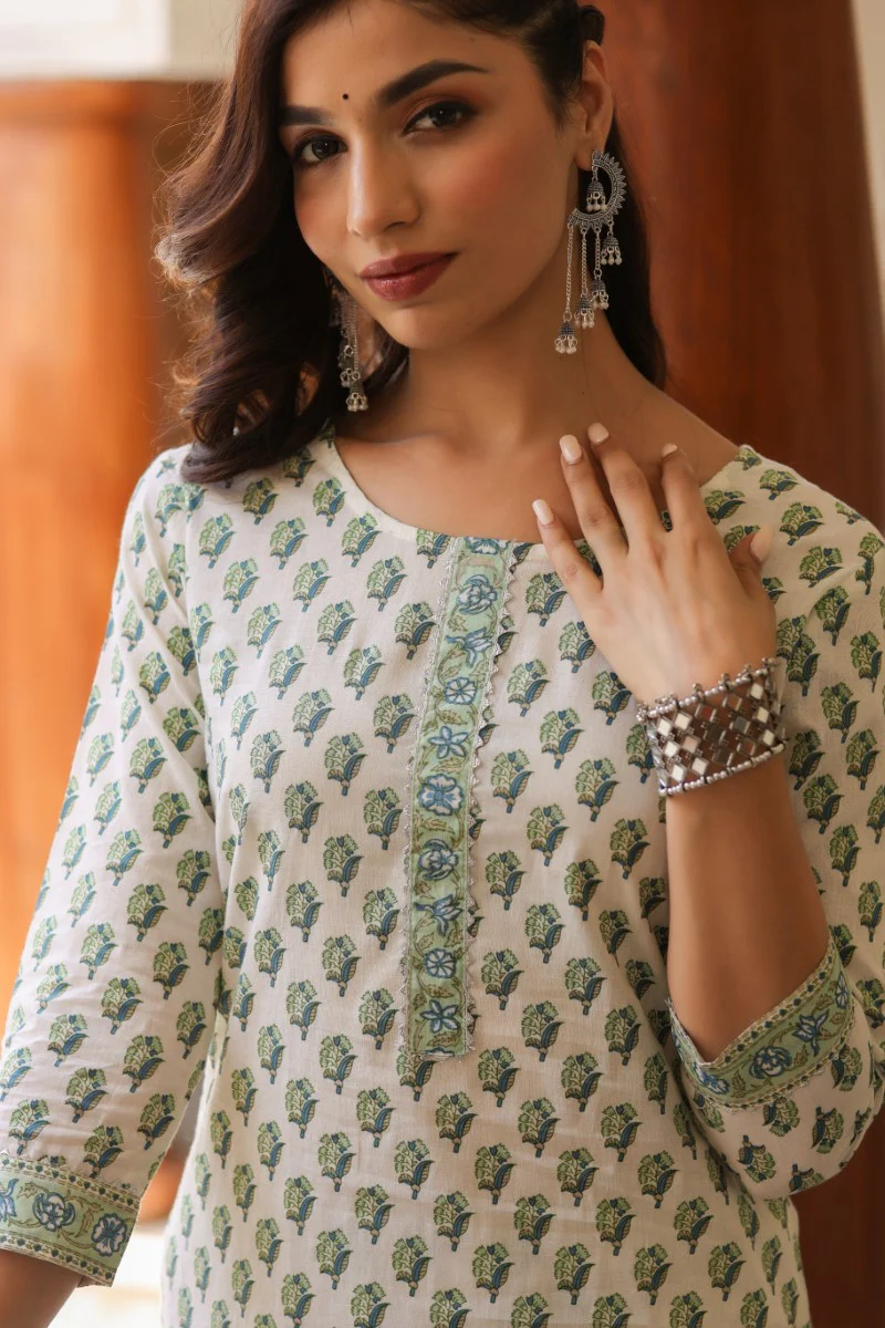 Our beautiful and elegant Ahika off white Rayon Blend kurta and palazzo set is perfect for your workwear wardrobe. This off white printed kurta set comes with printed palazzos that have an elasticated waistband and drawstring closure. The stunning calf length kurta features an elegant round neckline, three quarter sleeves and a straight hemline with side slits. Pair this beautiful white Kurta set with minimal jewellery and classic flats to complete your look.