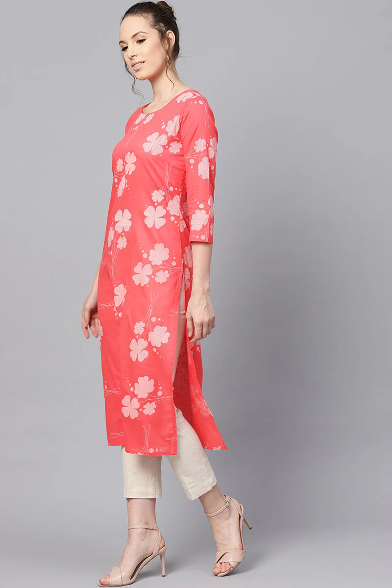 Ace a vivacious look every time you step out with Ahika’s beautiful and elegant pink cotton Kurti. The pink cotton material of the Kurti is extremely soft to the touch and lightweight too. It features floral prints, a round neckline, three-quarter sleeves, and a straight hemline. You can dress up in this Kurti for your next family occasion or office event by pairing it up with white leggings and minimal jewellery.