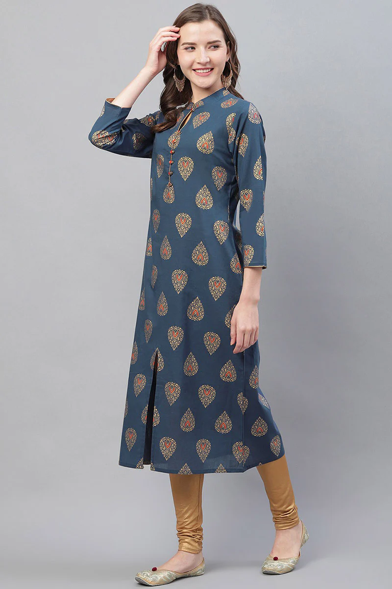 Navy Blue and Golden printed straight kurta, has a keyhole neck with button detailing, three-quarter sleeves, flared hem, and front slit
