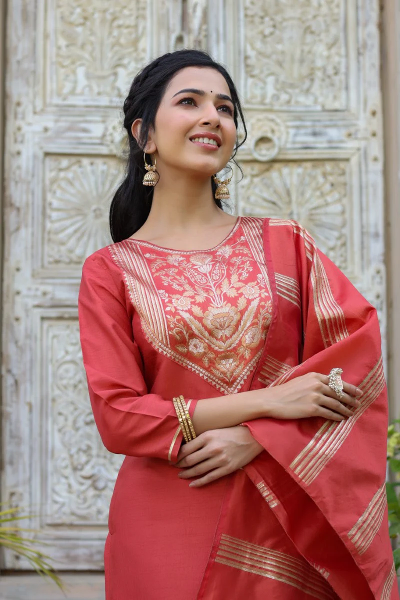 Channel rustic charm by sporting this poly silk suit set designed in rust color. The kurta features a round embroidered neckline with three-quarter sleeves. It consists of a parallel hemline and side cutouts. It is paired with straight trousers designed with a half elasticated waistband and a self design dupatta.