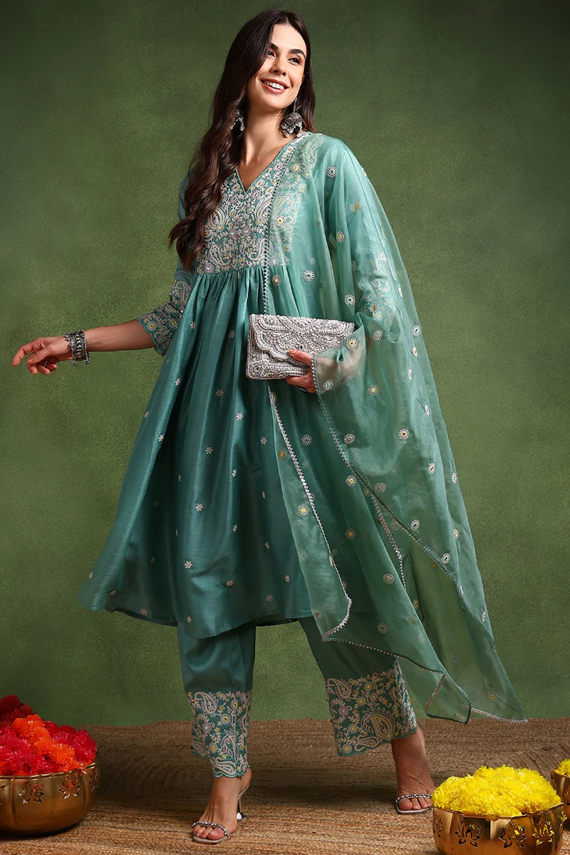 This beautiful sea green silk blend anarkali suit set is perfect for any special occasion. The suit features a solid yoke with intricate embroidery, a full-length anarkali kurta, and matching pants. The kurta has a flattering A-line silhouette and is adorned with delicate lace trim. The pants are slim-fitting and have an elastic waistband for a comfortable fit.
