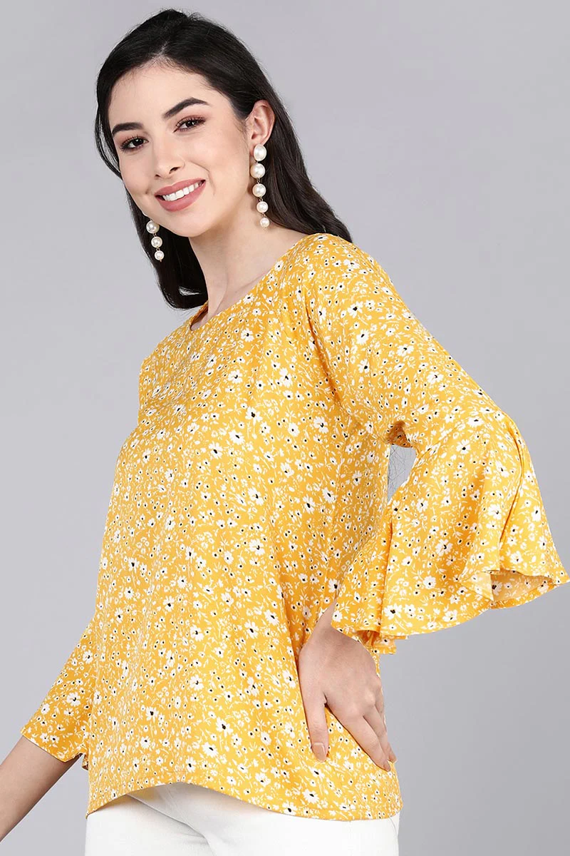 AHIKA Mustard Yellow Floral Print Crepe Top is perfect for any casual occasion. Its mustard yellow color and floral print adds a touch of femininity, while its round neck, woven crepe fabric, hook and eye closure, and bell sleeves make it the perfect combination of comfort and style.