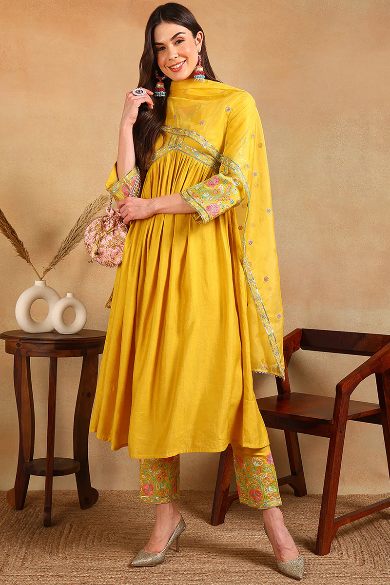 Yellow Silk Blend Embroidered Anarkali Suit Set PKSKD2046